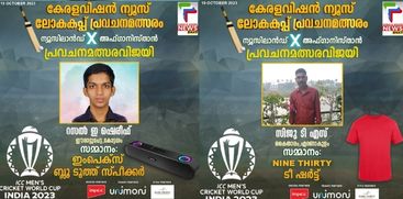 ഇന്ത്യയിൽ നടക്കുന്ന ലോകകപ്പിന്റെ കളിയാവേശത്തിൽ നാടും നഗരവും അലിഞ്ഞു ചേരുമ്പോൾ പ്രവചനമത്സരങ്ങളുമായി കേരളവിഷന് ന്യൂസും പ്രേക്ഷകർക്ക് കൈനിറയെ സമ്മാനങ്ങളുമായി പങ്കുചേരുന്നു. ഓരോ മത്സരവും ആര് ജയിക്കും. ആരുയര്ത്തും ലോക കപ്പ് കിരീടം. നേടാം ദിവസവും സമ്മാനങ്ങളും ബംബര് സമ്മാനങ്ങളും. ഓരോ മത്സരത്തിലും വിജയിക്കുന്ന ടീമുകളെ പ്രവചിക്കുന്നവരില് നിന്ന് തെരഞ്ഞെടുക്കുന്ന ഒരാള്ക്ക് 2,999 രൂപ വിലയുള്ള Impex Bluetooth Speaker സമ്മാനവും ദിവസേന NINE THIRTY ടീ ഷർട്ടുകളും