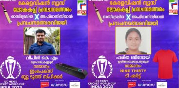 ഇന്ത്യയിൽ നടക്കുന്ന ലോകകപ്പിന്റെ കളിയാവേശത്തിൽ നാടും നഗരവും അലിഞ്ഞു ചേരുമ്പോൾ പ്രവചനമത്സരങ്ങളുമായി കേരളവിഷന് ന്യൂസും പ്രേക്ഷകർക്ക് കൈനിറയെ സമ്മാനങ്ങളുമായി പങ്കുചേരുന്നു. ഓരോ മത്സരവും ആര് ജയിക്കും. ആരുയര്ത്തും ലോകകപ്പ് കിരീടം. നേടാം ദിവസവും സമ്മാനങ്ങളും ബംബര് സമ്മാനങ്ങളും. ഓരോ മത്സരത്തിലും വിജയിക്കുന്ന ടീമുകളെ പ്രവചിക്കുന്നവരില് നിന്ന് തെരഞ്ഞെടുക്കുന്ന ഒരാള്ക്ക് 2,999 രൂപ വിലയുള്ള Impex Bluetooth Speaker സമ്മാനവും ദിവസേന NINE THIRTY ടീ ഷർട്ടുകളും