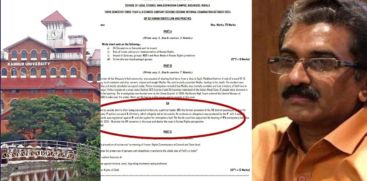 ത്രിവത്സര എൽ എൽ ബി മൂന്നാം സെമസ്റ്റർ ഇന്റേണൽ പരീക്ഷാ പേപ്പറിലാണ് എഡിഎമ്മിന്റെ ആത്മഹത്യ കേസ് പരാമർശിക്കുന്ന ചോദ്യങ്ങൾ വന്നത്.