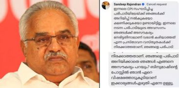 'ഇന്നലെ CPI സംഘടിപ്പിച്ച പരിപാടിയിലേയ്ക്ക് ഞങ്ങൾക്ക് അറിയിപ്പ് നൽകുകയോ ക്ഷണിക്കുകയോ ഉണ്ടായിട്ടില്ല. ഇന്നലെ നടന്ന പരിപാടിയുടെ അവസാനം ഞങ്ങൾക്ക് അസൗകര്യം നേരിട്ടതിനാലാണ് വരാൻ കവിയാത്തതെന്ന പ്രസ്താവന വസ്തുതയ്ക്ക് നിരക്കാത്തതാണ്. ഞങ്ങളെ പരിപാടി അറിയിക്കാതെ ഞങ്ങൾ എങ്ങനെ അസൗകര്യം പറയും? ബിനുമാഷിന്റെ പോസ്റ്റിൽ ഞാൻ ഏറെ വിഷമത്തോടുകൂടിയാണ് ഇക്കാര്യങ്ങൾ എഴുതി എന്നേ ഉള്ളൂ.'- സന്ദീപ് രാജേന്ദ്രൻ ഫെയ്സ് ബുക്കിൽ കുറിച്ചു.